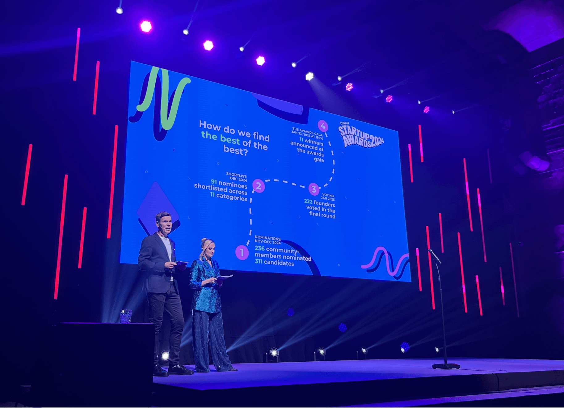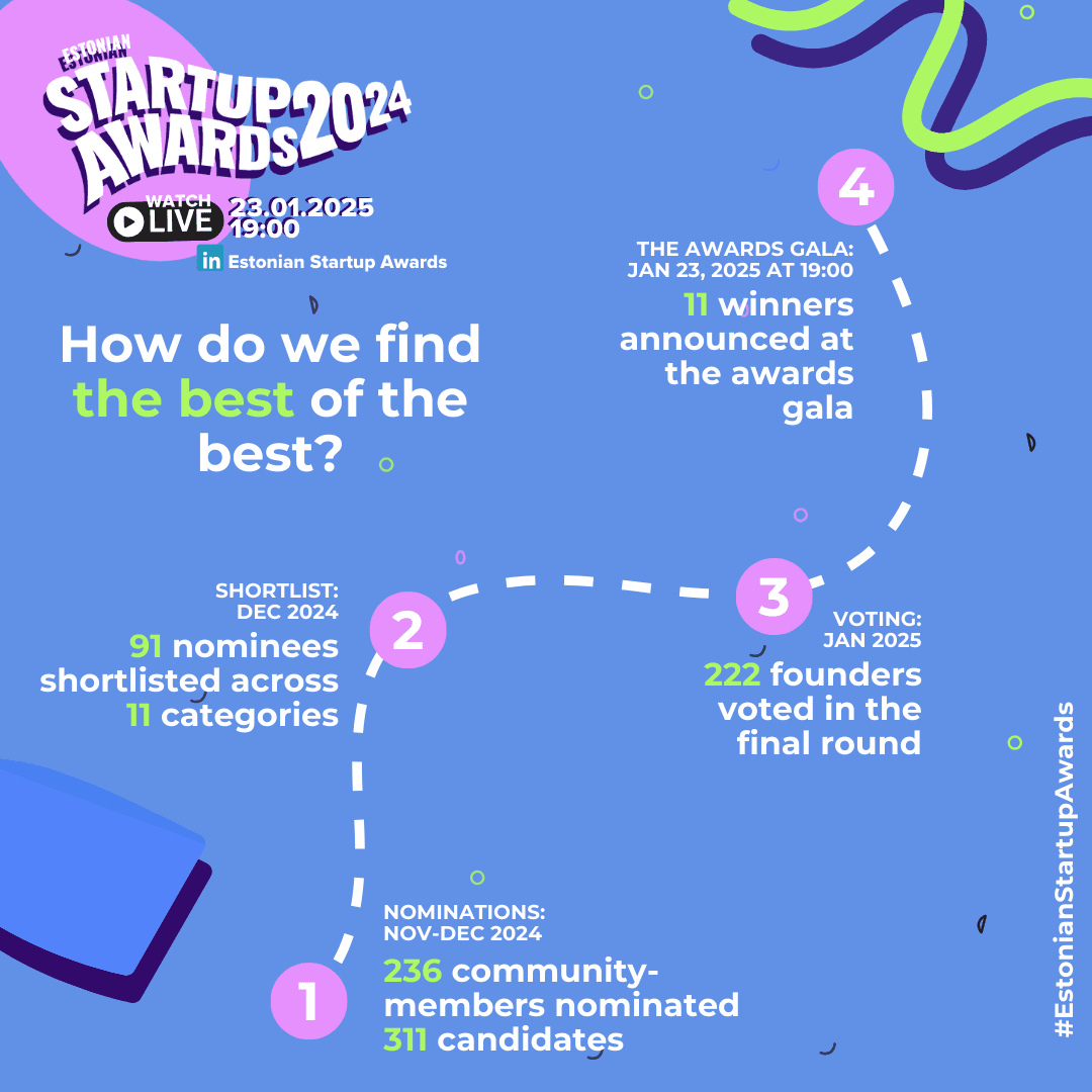 As traditional, the nomination round kicked off in November 2024. The first record of the year was already set when the community presented 311 names to be considered for the awards. After careful consideration, 91 candidates made it to the shortlist and were listed across 11 categories of Estonian Startup Awards 2024. We’re immensly grateful for the efforts of our jury - the 222 founders (thanks to the collaborative efforts of Estonian Founders Society and Startup Estonia) who cast a vote, thus helping to determine the winners in each category. Because who else would know better what it takes to lead a startup to success than a fellow founder!