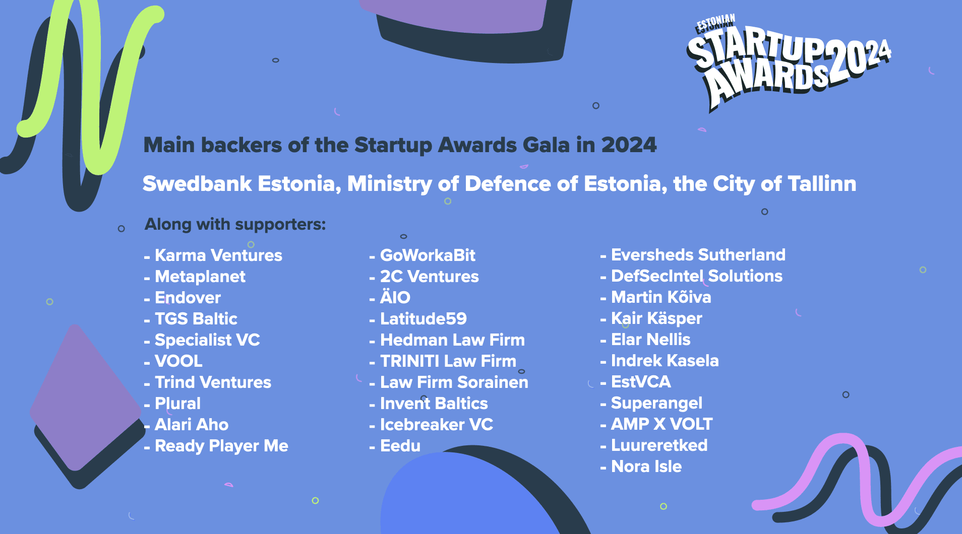 #EstonianStartupAwards 2024 - our community’s biggest celebration of the year - would not have been possible without the ecosystem builders and activists who have backed up the cause. Thank you for fueling the initiative: 2C Ventures, ÄIO, Alari Aho, AMP X VOLT, DefSecIntel Solutions, Eedu, Elar Nellis, Endover, Estonian Private Equity & Venture Capital Association (EstVCA), Eversheds Sutherland, GoWorkaBit, Hedman Law Firm, Icebreaker.vc, Indrek Kasela, Invent Baltics, Kair Käsper, Karma Ventures, Latitude59, Martin Kõiva, Metaplanet, Plural VC, Ready Player Me, Sorainen, Specialist VC, Superangel, TGS Baltic, Trind Ventures, Triniti Advokaadibüroo, and VOOL.
