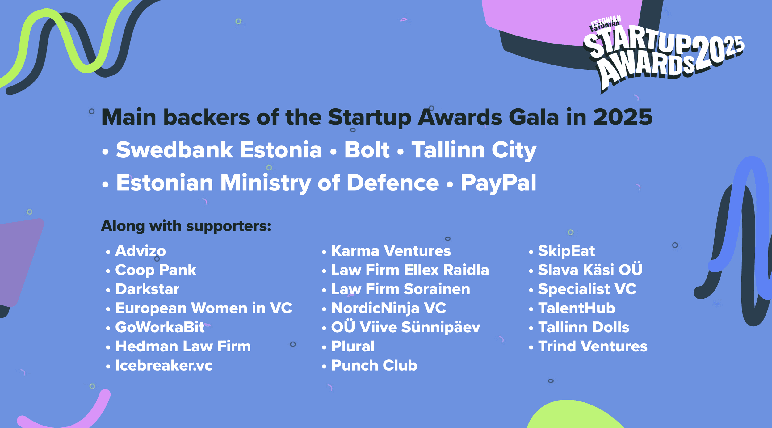 #EstonianStartupAwards 2025 - our community’s biggest celebration of the year - would not have been possible without the ecosystem builders and activists who have backed up the cause. Thank you for fueling the initiative: Advizo, Coop Pank, Darkstar, Ellex Raidla, EIS, European Women in VC, GoWorkaBit, Hedman, Icebreaker.vc, Karma VC, Nordic Ninja VC, Plural VC, Punch Club, SkipEat, Slava Käsi OÜ, Sorainen, Specialist VC, TalentHub, Tallinn Dolls, Trind Ventures, and Viive Sünnipäev OÜ.