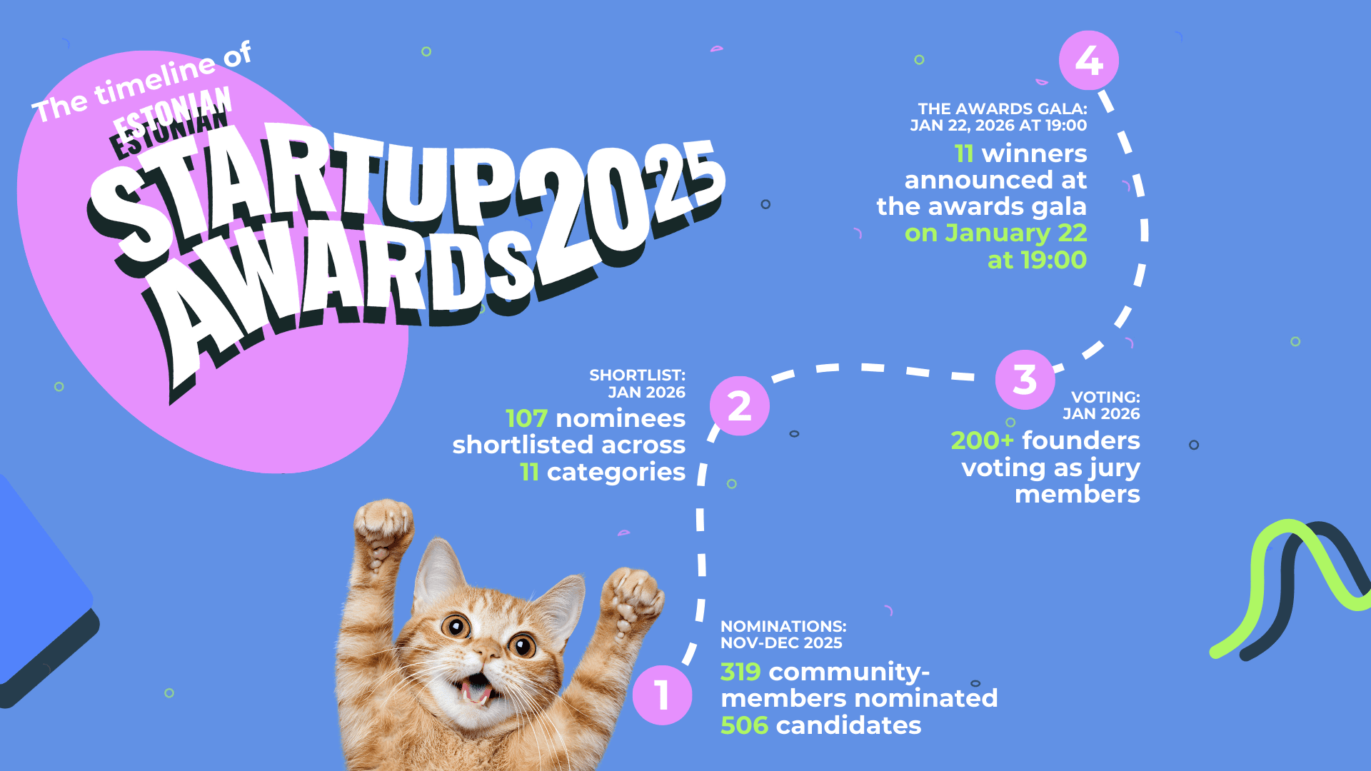 As traditional, the public nomination round kicked off in November 2025. The first record of the year was already set when the startup community at large presented 506(!) names/nominees to be considered for the awards. That’s a significant growth from previous nomination rounds, demonstrating the vitality and maturity of the Estonian startup community after the previous years of crises and challenges. We’re on a good track!