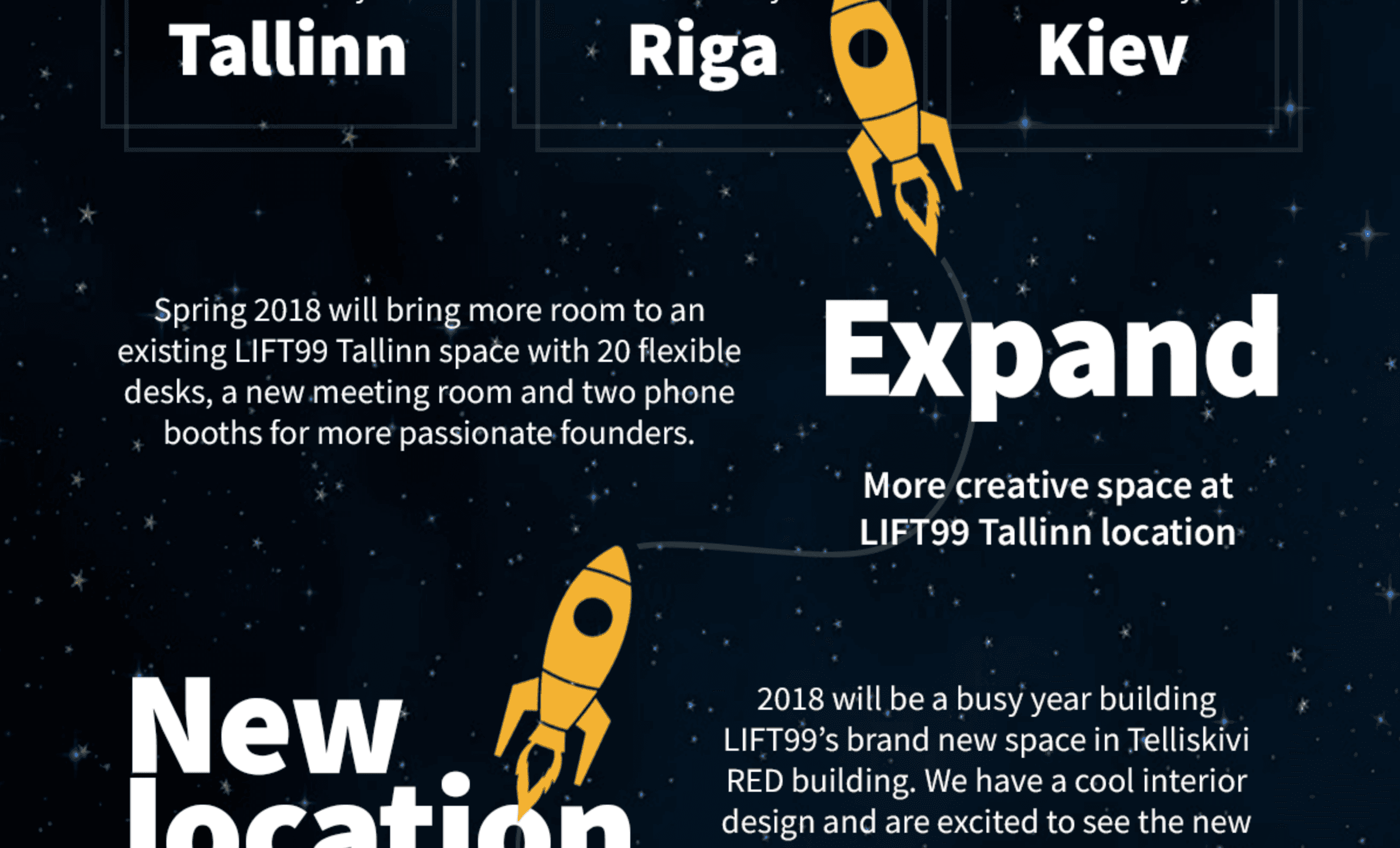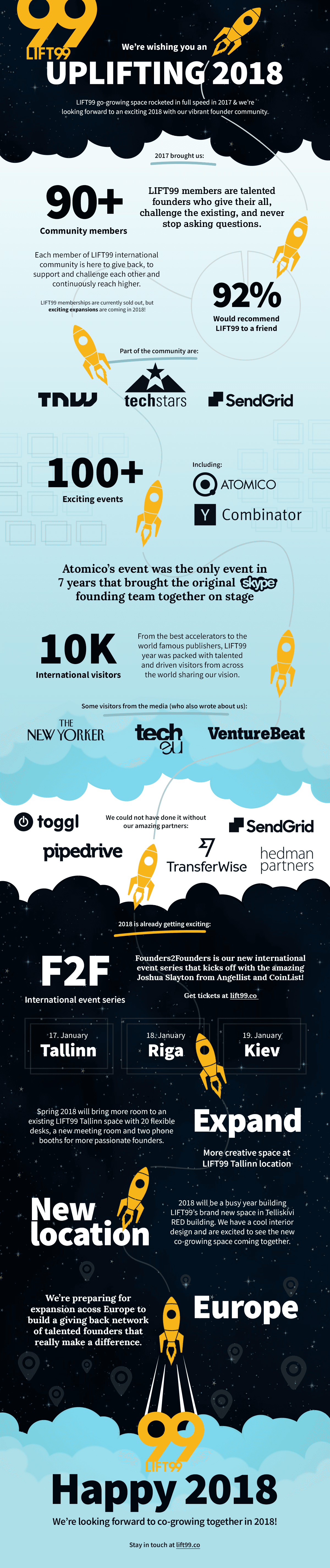 LIFT99 co-growing space rocketed in full speed in 2017 - we have built a community that shares the founders to founders mentality and is constantly growing. Moreover, last year was filled with 100+ events and 10 000+ guests visiting us.
